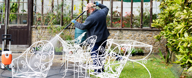 If you’re packing away patio furniture for the winter, now is the best time to give everything a decent cleaning so your furniture is ready to use when Spring comes back around. No need to go overboard though — they’re bound to gather dust before next season — but for now, wipe dirt and debris off tables and chairs, and spray and wipe down everything with water. Make sure it all dries completely before storing it indoors or covering it with a patio-furniture cover. Remember, if you’re using furniture cover, be sure to tie each one to the furniture’s legs so that it stays in place.
