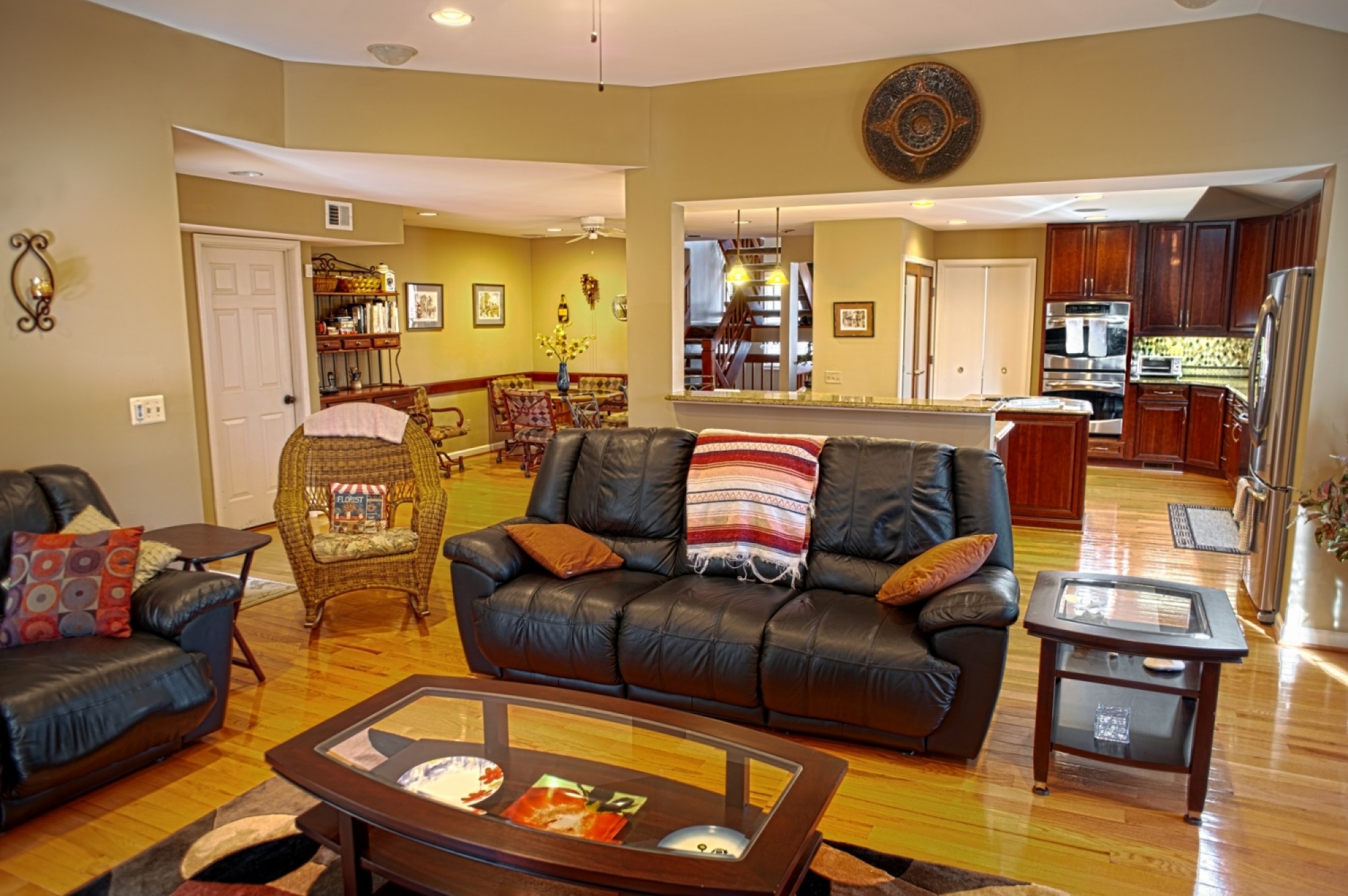 This warm kitchen in Owings Mill is open to the living room and a breakfast nook. It has an island with a built-in electric cooktop, a counter with bar seating, and a stacked double oven.